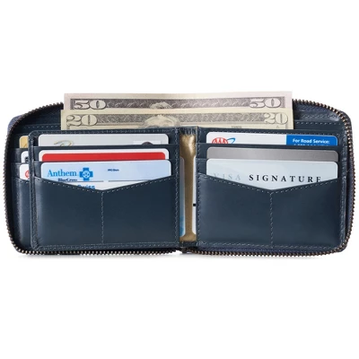 - LOGAN ZIPPER BIFOLD – MSRP $45 – RFID protection against electronic theft of your credit cards and identity. Secure all round zipper closure on our Logan bifold protects your cash and other valuables from falling out of it. The Logan Zipper Bifold will easily fit in your back pocket. After a few weeks of use, this genuine leather wallet will begin to stretch and conform according to your needs, just like an expensive pair of leather shoes.
