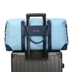 The Barbara is a canvas and faux leather weekend suitable for travel or everyday fashion. Features gold hardware, two medium-length handles, a removable shoulder strap, a main compartment with organizer pockets, an exterior zipper pocket, and a trolley passthrough.