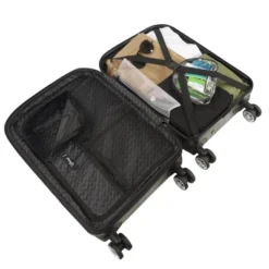 The adorable and popular Minnie Mouse shows a playful on the front of this molded hard-sided 21-inch carry-on spinner suitcase that is perfect for carrying on for your next vacation. -Made with durable ABS Plastic and Pc film with a playful molded Minnie Mouse on the front. -Supported on 8 stable spinner wheels for hassle-free wheeling. -Convenient aluminum telescopic handle is easy to grip. -Sizeable polyester-lined main compartment is divided for easy organizing. -Interior includes 2 mesh zip pockets and a zip wet dry compartment for personal essentials. -Clothing compression straps help prevent contents from shifting/wrinkling.-Expandable for more space with a 2 inch gusset. -Retractable top and side carry handles for loading into trunks, cars, and overhead bins.-Easy to spot clean. -5 year warranty. -Silver hardware.-22H X 14W X 9.5D-Imported.-This product may contain a chemical known by the state of California to cause cancer, birth defects, or other reproductive harm. www.p65warnings.ca.gov