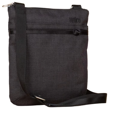 Water resistant lining and coating. Secure zip closure. 2 exterior pockets (1 zip & 1 slip). 1 interior slip pocket & 1 interior RFID card slot . Adjustable crossbody shoulder strap.