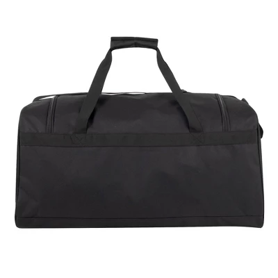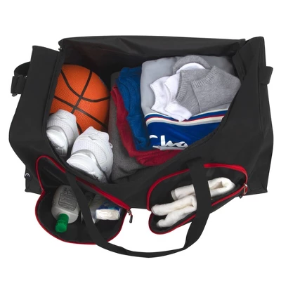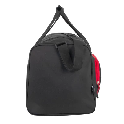 - DETAILS: This overnight bag measures 24” x 12” x 11.5” and is crafted of rugged, durable polyester cloth materials. Black with fun “pop” trim color, your bag will always stand out at the airport, the big game, or anywhere