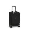 - Upright suitcase features side-mounted upright wheels, a push-button locking handle, and cross straps inside