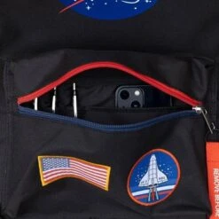 Embark on an extraterrestrial adventure with our NASA Exploration Backpack! Designed to fuel your cosmic curiosity, this stellar backpack is a must-have for space enthusiasts. Safely stow your laptop in the padded compartment, while the front pocket internal organizer keeps your essentials in order. Stay hydrated on your intergalactic quests with the handy side mesh water bottle pockets. Enhancing both style and safety, the backpack features reflective tabs for increased visibility. Adorned with front pocket patches displaying the American flag and iconic rocket ship, you’ll proudly showcase your passion for space exploration. Unleash your astronaut spirit with the NASA Exploration Backpack, available now!