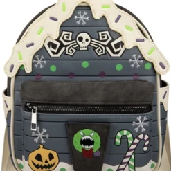 - CUSTOM DESIGN: Christmas decorations appear across the house design on this mini backpack while Jack and Sally sit on the side pockets. 3D applique frosting and a front door add depth to the design. Nightmare Before Christmas fans will love this bag.