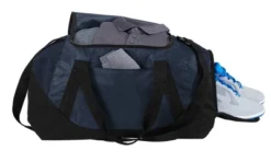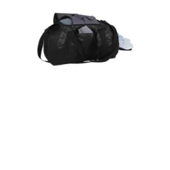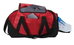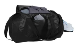 With its spacious main compartment ventilated shoe compartment and sporty look this competitively-priced duffel is sure to be a hit with athletes and teams.420 denier honeycomb polyester 600 denier polyester Large main compartment Zippered end shoe compartment with mesh window for breathability Front slip pocket for easy decoration Web carrying handles with contrast stitching Adjustable shoulder strap Dimensions: 12.5 h x 19.75 w x 12 d; Approx. 2 962 cubic inchesNote: Bags not intended for use by children 12 and under.