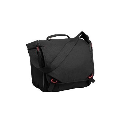 This flexible messenger holds and protects your electronics: from laptops to tablets. Many pockets hold cords batteries headphones paperwork and magazines. 600 denier mini ripstop polyesterBack compartment with side-entry laptop sleeveLarge main compartment with padded tablet sleeveZippered pocket on front flap for easy embellishmentZippered side pocketsPadded top handle with adjacent zippered pocketBack pocket converts to Pullman handle attachment sleeveAdjustable shoulder strap Laptop sleeve dimensions: 11.5 h x 16 w 1.75 d; fits most 15 laptops Dimensions: 12 h x 16 w x 6 d; Approx. 1 150 cubic inchesNote: Bags not intended for use by children 12 and under. Includes a California Prop 65 and social responsibility hangtag.