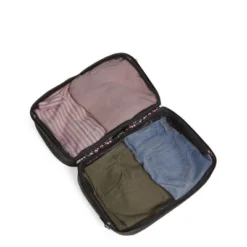- Large main compartment with D-shaped zippered entry, zippered end pocket, and front zippered pocket