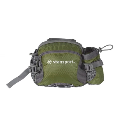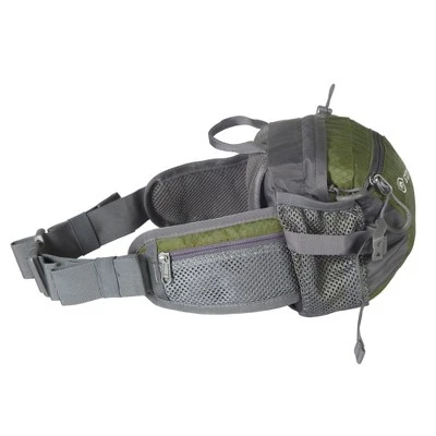 - Includes 2 zippered main pockets, 2 mesh waistbelt pockets, water bottle pocket, and mesh gel pocket