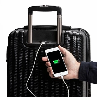 The SWISSGEAR 7272 Energie collections combines a rugged PolyCarbonate hardshell and architectural design, while its eight multi-directional spinner wheels provide 360-degree maneuverability. Energie introduces USB capability so you can now rejuvenate your drained smartphone or tablet right from the convenience of your luggage. An internal mesh pocket hides the USB cord that is connected to the back of its exterior so hook it to your power bank (not included) to charge a low-battery. The split main compartment features a tie-down clothing compartment with zippered accessory pocket, and a large zippered compartment with additional mesh and cinched pockets. Also includes 2″ expandable packing space, and an integrated TSA-approved lock for extra security.