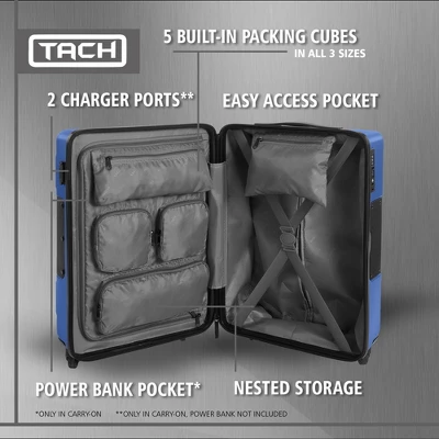 - Single hardshell carry-on suitcase makes travel effortless; Connect up to 6 Tach bags for easier transport; Includes 5 interior packing cubes