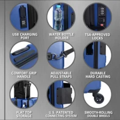 - 360-degree silent and smooth ball bearing wheels glide effortlessly through airport terminals; 2 charging ports keep your devices powered up during long travel days