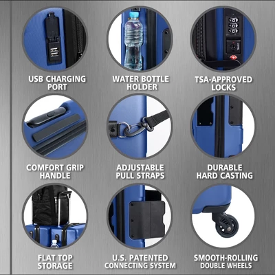 Make travel more convenient and fuss-free while on family vacation or flying solo with the help of the TACH V3 Hardshell Carry-On Suitcase. Featuring a connectible luggage system, this sleek travel case lets just one person handle multiple carry-on bags without the need for a luggage cart. Whether you’re globetrotting alone or roadtripping with the kids, skip the light packing and instead use the adjustable pull strap to easily maneuver up to 9 fully-loaded suitcases. The 360-degree ball bearing wheels roll effortlessly through airport terminals without snagging or flipping over your baggage. If you need to run and catch a connecting flight, enjoy an uninterrupted, natural stride thanks to the adjustable comfort grip handle. Easily load and unload your luggage from the overhead bin with ergonomic side straps. This standard carry-on is regulation size for domestic and international flights, so you can avoid checking fees. A spacious interior with 5 built-in pockets pairs with the flat top design to easily hold all your clothes, laptops, and personal items. The hard exterior shell and TSA-approved locks ensure your valuables stay protected.Wherever your next journey takes you, be sure to have your TACH V3 Hardshell Carry-On Suitcase in tow.